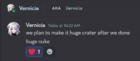 The WPR condemnation came alongside two pieces of screenshot evidence, the first showing Vernicia assuring one of the perpetrators, who provided information to the WPR on the condition of anonymity, not to worry, saying, “dont fcking worry u have the most scarry[sic] person behind u to protect u”, and claiming to have Dragon Law pre-paid in case of legal action. The second piece of evidence shows Vernicia telling perpetrator MikeOxlonger1 AKA Profitfeind AKA LiveLaughToaster that “we plan to make [Anville] huge crater after we done.”